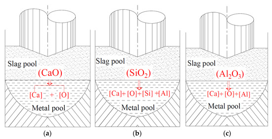 Reaction model between remelting slag system and molten steel. (a) High-basicity remelting slag. (b) Low-basicity remelting slag. (c) Al2O3-containing remelting slag.