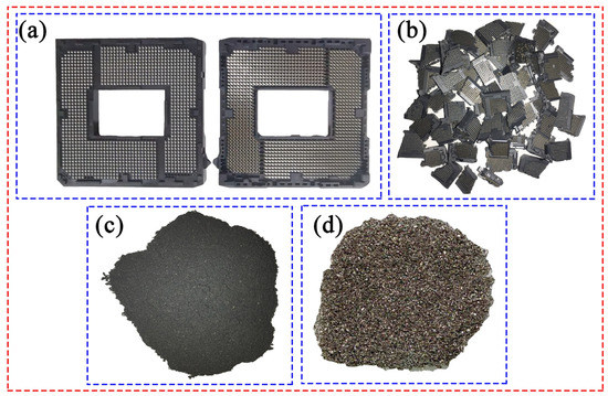 (a) CPU socket, (b) CPU socket pieces, (c) CPU socket powder, (d) metallic powder.