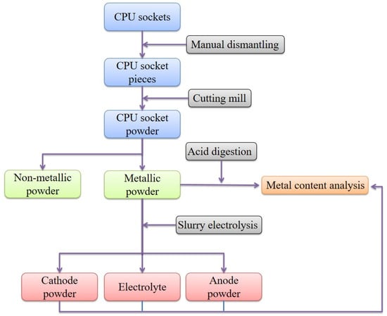 CPU sockets need to be pre-processed before slurry electrolysis. Zhao et al. [17] separated the valuable metals from wasted mobile phone PCB particles using the liquid–solid fluidization technique. Hanafi et al. [18] reported that a ball-milling machine was preferable to a disc-milling machine, due to its uniform pulverization, but ball-milling required a longer time than disc-milling. Yi et al. [19] cut CPU sockets first, and then shredded them into pieces, with diameters less than 2 mm, using a cutting mill.