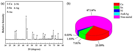 The metal content of the metallic powder was detected by ICP-AES, which was consistent with the composition analysis by XRD. The amounts of different components in the CPU socket sample are summarized in Figure 4b.