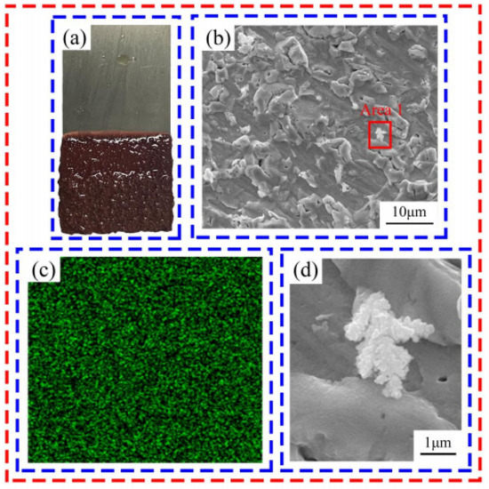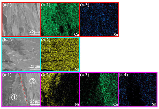 Figure 5(a-1) shows an SEM image of the CPU socket powder fracture surface. It was detected, by EDS mapping, that the main elements of the CPU socket powder fracture surface were Cu and Sn. The results are displayed in Figure 5(a-2,a-3). Figure 5(b-1) shows an SEM image of the CPU socket powder surface, and Figure 5(b-2) shows the EDS mapping of the SEM image. It was indicated that only Ni was detected. In Figure 5(c-1), part 1 is the CPU socket powder surface and part 2 is the CPU socket powder fracture surface, Figure 5((c-2)–(c-4)) shows that the metal matrix is Cu and Sn, and Ni is plated on the surface as a coating.