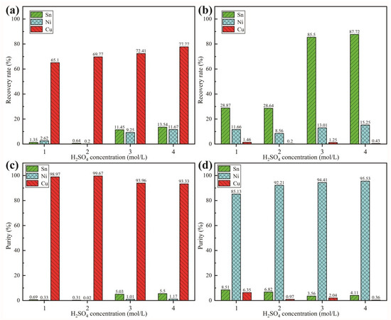 Figure 7c shows the purity of Cu in the cathode after the slurry electrolysis experiment, the purity of Cu first increased from 98.97% to 99.67% and then decreased to 93.33%, being highest at the H2SO4 concentration of 2 mol/L. The purity of the Sn and Ni in the cathode, after slurry electrolysis, remained at a low level as the H2SO4 concentration increased. The purity of Cu in the electrolyte after the experiment decreased, from 6.35% to 0.36%, when the H2SO4 concentration increased, as displayed in Figure 7d. The purity of Ni in the electrolyte decreased from 8.51% to 4.11% when the H2SO4 concentration increased, meanwhile, the purity of Sn in the electrolyte increased from 85.13% to 95.53%, as shown in Figure 7d.