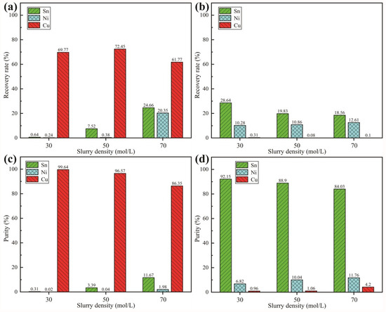 Figure 8 demonstrates the effect of slurry density on the purity and recovery rate of the metals. Experiments were conducted at different slurry densities, of 30, 50, and 70 g/L. The other conditions were: H2SO4 concentration 2 mol/L, current density 80 mA/cm2, reaction time 7 h, and reaction temperature 15 °C. Figure 8a shows that the recovery rate of Cu in the cathode first increased, from 69.77% to 72.45%, and then decreased to 61.77% when the slurry density increased from 30 g/L to 70 g/L. Figure 8b shows that the recovery rate of Cu in the electrolyte was 0.10% at 30 g/L, 0.08% at 50 g/L, and 0.31% at 70 g/L, and obviously, the value is approximately 0%, thus Cu cannot be found in the electrolyte. The recovery rates of Sn and Ni in the cathode increased with the increase in slurry density. Sn increased from 0.64% to 24.66%, and Ni increased from 0.24% to 20.35%, when the slurry density increased from 30 to 70 g/L, as shown in Figure 8a. The recovery rate of Sn in the electrolyte decreased, from 28.64% to 18.56%, when the slurry density increased from 30 to 70 g/L. At the same time, the recovery rate of Ni in the electrolyte increased from 10.28% to 12.61%, as shown in Figure 8b.
