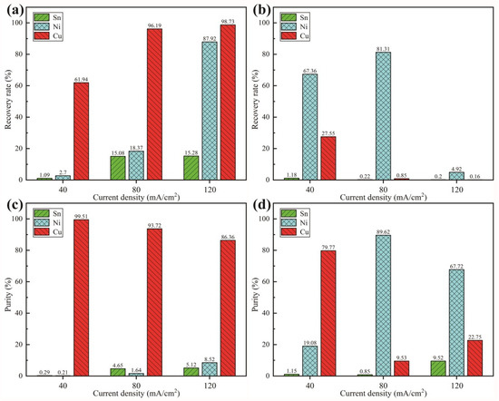 Figure 10 displays the effect of current density on the recovery rate and purity of Cu, Sn, and Ni. Experiments were conducted at different current densities, of 40, 80, and 120 mA/cm2. The other conditions were: H2SO4 concentration 2 mol/L, slurry concentration 30 g/L, reaction time 7 h, and reaction temperature 15 °C. Figure 10a shows that the recovery rate of Cu increased from 61.94% to 98.73%, when the current density increased from 40 mA/cm2 to 120 mA/cm2. The increasing current also caused the recovery rate of Ni to increase from 2.70% to 87.92%, and the recovery rate of Sn from 1.09% to 15.28%. However, the increase in the value of the recovery rate of Cu was not obvious, while the increase in the recovery rate of Ni was nearly five times higher that of Cu, with the increase in current density from 80 mA/cm2 to 120 mA/cm2. Figure 10c shows that the purity of Cu in the cathode was 99.51%, 93.72%, and 86.36%, when the current density was increased from 40 mA/cm2 to 120 mA/cm2. Meanwhile, the purity of Sn and Ni increased at low current density levels. When the current density increased from 40 to 120 mA/cm2, the recovery rate of Cu and Sn in electrolysis decreased from 27.55% and 1.18%, to 0.16% and 0.20%, respectively, but the recovery rate of Ni increased firstly and then decreased (Figure 10b). Additionally, the purity of Sn in electrolysis decreased when the current density increased. The purity of Cu in electrolysis decreased first and then increased when current density increased, while the purity of Ni in electrolysis increased first and then decreased (Figure 10d).
