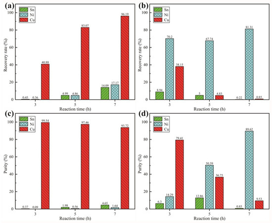 Figure 11 exhibits the effect of reaction time on the recovery rate and purity of Cu, Sn, and Ni. Experiments were conducted at different reaction times, of 3 h, 5 h, and 7 h. The other conditions were: H2SO4 concentration 2 mol/L, slurry concentration 30 g/L, current density 80 mA/cm2, and reaction temperature 15 °C. Figure 11a shows that when reaction time increased from 3 to 7 h, the recovery rate of metals increased, for Cu this increased from 40.88% to 96.19%, for Sn from 0.45% to 14.09%, and for Ni from 0.36% to 17.17%. Figure 11c shows that the purity of Cu in the cathode was 99.54%, 97.46%, and 93.72%, respectively, when the reaction time was increased from 3, to 5, to 7 h. Meanwhile, the purity of Sn and Ni remained at a very low level (no more than 5%). In Figure 11b, when reaction time increased from 3 to 7 h, the recovery rate of Cu and Sn during electrolysis decreased, from 38.15% and 8.94%, to 0.85% and 0.22%, respectively, but the recovery rate of Ni stayed at a high level during electrolysis. In Figure 11d, the purity of Sn increased first and then decreased, the purity of Cu decreased, while the purity of Ni increased during electrolysis when the reaction time increased from 3 h to 7 h.