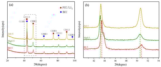 The XRD patterns of the three as-cast HEAs of B0.5, Mg0.5, and Zr0.5 are shown in Figure 1a. The diffraction peaks for face-centered cubic (FCC) structure and body-centered cubic (BCC) structure are observed in all alloys. The intensity of the FCC diffraction peaks in the three HEAs is higher than that of the BCC diffraction peaks, indicating that the content of FCC phase in the three HEAs is higher than that of the BCC phase. Combined with the microstructure shown in Figure 2, the FCC diffraction peaks overlap with those of the L12 phase, so the diffraction peaks of the L12 phase cannot be distinguished in the XRD pattern. This may be due to the small particle size of L12 precipitates and the peak broadening effect caused by the similar crystal structure of these precipitates and the matrix. At the same time, some studies have shown that there is a coherent interface between the matrix FCC and the L12 phase, which also makes it more difficult to distinguish the diffraction peaks of the L12 phase [,]. Since the elements Mg and Zr have much larger atomic radius than the element B, the dissolution of Mg or Zr into the alloy causes the FCC peaks of Mg0.5 and Zr0.5HEA to shift slightly to the left, as shown in Figure 1b. Due to the small doping amount, the peak deviation amplitude is not considerable. The results show that the lattice parameters of the FCC phase in Mg0.5 and Zr0.5 alloys are larger than those of the B0.5 alloy [,]. The lattice parameters of the three HEAs were obtained from the corresponding refined XRD patterns. The lattice constants (a) of the FCC phase in B0.5, Mg0.5 and Zr0.5 alloys were calculated to be 3.5937, 3.6051 and 3.6036 Å, respectively. The three as-cast HEAs have nearly the same lattice parameter. The lattice constants of Mg0.5 and Zr0.5 are slightly larger than that of B0.5.