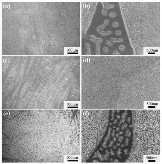 Figure 2 shows the SEM micrographs of the as-cast alloys. All the alloys exhibit typical casting dendritic and inter-dendrite morphology. Due to the high cooling speed of the vacuum arc-melting technique, constitutional supercooling of the cast ingot increases to make a dendrite structure. According to literature reports, the microstructure of some other types of alloys also showed a typical dendrite morphology. For example, Zr was added to the AlCoCrCuFe HEA with equal molar ratio and the dendrite structure was refined significantly []. Moreover, Ni40Fe30Co20Al10 and (Ni40Fe30Co20Al10)90Ti10 HEAs both exhibited trench-like interdendrite and cellular-like dendrite structures. It was found that the dendrite structure of the alloy was finer after the addition of Ti []. Compared with the microstructure of the Zr0.5 alloy and the Mg0.5 alloy, the B0.5 alloy has well-developed primary dendrite arms and poorly-developed secondary dendrite arms, with long primary dendrite arms. This result demonstrates that the B element has weaker constitutional supercooling effects compared to the Mg element and Zr element on this HEA. In the high magnification image of the inter-dendrite region (Figure 2b), a black region and numerous nano precipitates are observed. The black region is the enlarged morphology of the strip-like bulge in the inter-dendrite region in Figure 2a. Combined with XRD and SEM analyses of the alloy, it can be preliminarily inferred that the nano precipitate is the L12 phase in the FCC matrix, and the black region is the BCC phase. Furthermore, the FCC/L12 mixed structure can be observed in the BCC phase, as shown in Figure 2b. At the junction of the FCC matrix and the BCC phase, there are a few coarsened L12 phases. Unlike the finely spherical nanoparticles that are uniformly distributed far from the boundaries of the black region, these particles appear as elongated strips. This may be due to the non-uniform distribution of elements in the as-cast alloy, which causes the segregation of some elements near the phase boundaries [,,]. The dendritic and inter-dendritic microstructure of the as-cast Mg0.5 alloy (Figure 2c) is coarser than that of B0.5 HEA and Zr0.5 HEA. Numerous approximately spherical L12 precipitates are uniformly scattered, as seen in Figure 2d. However, other precipitated phases with different morphologies are not observed in Figure 2d. Further research must be conducted to pinpoint the exact position of the BCC phase. The histomorphology of the as-cast Zr0.5 alloy (Figure 2e,f) is similar to that of the as-cast B0.5 alloy. The Zr0.5 alloy also has a BCC phase and FCC/L12 mixed structure. For further quantitative analysis of precipitated phase, the statistics of the size of L12 precipitates in the as-prepared alloys are obtained by image-pro plus software. For the convenience of statistics and analysis, L12 precipitates are regarded as spheres. The average particle sizes of L12 precipitates inside the grains of the three alloys are 41.45 nm (B0.5), 58.76 nm (Mg0.5) and 49.90 nm (Zr0.5). It is seen that the average particle size of L12 particles in the alloy doped with B is relatively small, followed by the Zr0.5 and Mg0.5 alloys. Compared to Mg and Zr, the addition of B contributes more to the size refinement of the L12 precipitates in the alloy.