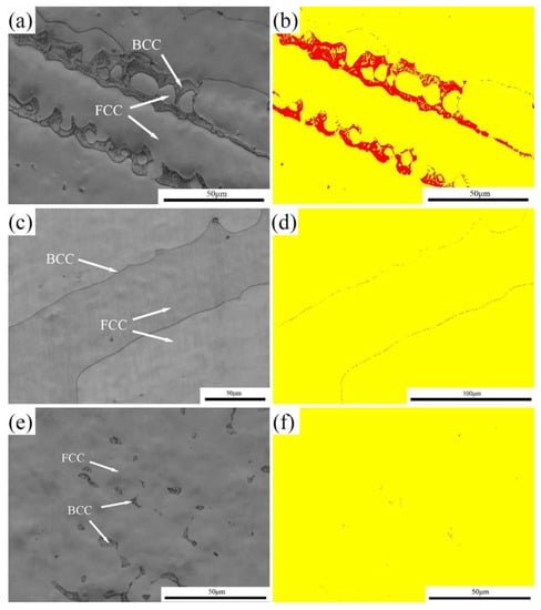 As illustrated in Figure 3, the precise positions of the FCC and BCC phases were investigated using the EBSD technique. The FCC and BCC phases are represented by yellow and red hues, respectively. As seen in Figure 3b, the BCC phase is mainly distributed in the inter-dendritic region of the B0.5 HEA, and a small number of FCC phases are also observed in the BCC phase. As seen in Figure 3d, BCC phase is mainly observed in the grain boundary region of the Mg0.5 alloy, and its proportion in the phase diagram is 0.4%. The proportion of BCC phase in the Zr0.5 alloy is about 0.8%, which shows a short rod-like morphology. The relative proportion of BCC phase in the B0.5 alloy is the highest, about 13%. Compared with Mg and Zr, the addition of B promotes the formation of BCC phase in the alloy. Combined with SEM analysis, it is evident that the addition of Mg has no significant effect on the size of L12 particles at the phase boundary, while the addition of B significantly increases the size of L12 particles near the BCC phase distributed along the grain boundary. The inhomogeneous distribution of elements in the as-cast alloy may be the cause of this phenomenon. It may also be caused by the segregation of Ti elements at the grain boundaries [,].