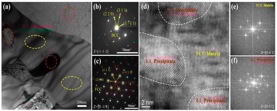 A TEM investigation was conducted to reveal the complex microstructure of the as-cast B0.5 HEA, as illustrated in Figure 4. The bright-field image of the as-cast B0.5 HEA is depicted in Figure 4a, which shows the BCC phases and the FCC matrices, which are denoted by yellow and red dashed circles, respectively. Notably, several fine precipitates can be found in the FCC matrix. Two diffraction spots are observed in the selected area electron diffraction (SAED) patterns (Figure 4b,c), corresponding to the different color regions. This confirms that the matrix and precipitate have FCC and BCC crystal structures, respectively. The FCC matrix and L12 precipitate particles (Figure 4c) are both confirmed by the [0 −1 1] FCC SAED pattern [,]. The high-resolution transmission electron microscopy (HRTEM) image (Figure 4d) and the corresponding fast Fourier transformation (FFT) image (Figure 4e,f) further demonstrate that the matrix and fine precipitates have a disordered FCC crystal structure and an ordered L12 superlattice structure, respectively.