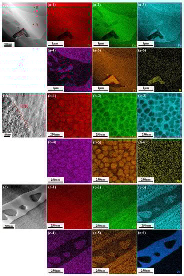 HAADF-STEM images and STEM-EDX maps of the three as-cast HEAs are shown in Figure 5. According to the preceding discussion, the different regions in the B0.5 HEA (Figure 5a) are denoted by points A, B, and C, respectively. The specific elemental content of each point is shown in Table 1. It can be observed that point A is enriched in Ni, Co, and Ti elements but depleted in Al. Point A is the BCC precipitate, as confirmed by the [−1 −1 −2] SAED pattern in Figure 4b, with an average chemical composition of Ni: 48.7 at. %, Co: 28.0 at. %, Fe: 13.7 at. %, Al: 0.2 at. %, and Ti: 9.4 at. %. The [0 −1 1] SAED pattern in Figure 4c confirms the existence of both the FCC matrix and the L12 precipitates at point B. The average chemical composition at this point is Ni: 45.9 at. %, Co: 23.7 at. %, Fe: 26.0 at. %, Al: 1.8 at. %, and Ti: 2.6 at. %. Point C is enriched with Ti and B elements. Formation of intermetallic compounds is promoted by the relatively high negative mixing enthalpy between Ti and B elements. It has been demonstrated that Ti addition has little effect on the dendritic morphology of as-cast Ni-rich HEAs, but causes severe component segregation in the matrix, which further promotes the formation of the BCC phase. Therefore, it is speculated that a rod-like boride with a Ti-rich phase may be mainly distributed near the BCC phase [,,,]. From the STEM-EDX images of the Mg0.5 HEA in Figure 5b, it can be seen that the matrix contains a large number of spherical-like precipitates that are uniformly distributed. The precipitates are mainly rich in Ni, Al, and Ti elements and poor in Co and Fe elements. The distribution of elements in the matrix has the opposite trend of these precipitates. This phenomenon can also be seen in the STEM-EDX images of the Zr0.5 HEA in Figure 5c. Specifically, the L12 precipitate is enriched in Ni, Al, and Ti elements, but depleted in Co and Fe elements. In contrast, the FCC phase is enriched in Fe and Co elements and poor in Ni, Al, and Ti elements. The above results verify that the matrix and precipitates in the three as-cast HEAs are indeed FCC phase and L12 precipitates, respectively. The stoichiometry of L12 precipitates may be (Ni, Co, Ti)3(Al, Ti) [,,]. From the STEM-EDX images of the Mg0.5 HEA in Figure 5b-6, it can be seen that the Mg element is uniformly distributed throughout the matrix. However, no significant changes in elemental composition are found near the grain boundaries, which is the possible BCC phase distribution. The STEM-EDX mapping results of the Zr0.5 HEA are shown in Figure 5c. Ni is more uniformly distributed, Al is mainly distributed in the FCC/L12 mixed structure, while Zr prefers to exist in the BCC phase. Co and Fe elements are enriched in the FCC matrix, and Ti is enriched in L12 nano precipitates. Moreover, although Ni is distributed relatively uniformly, it is enriched in L12 nano precipitates [,,,]. Due to the relatively low content of added trace elements, the specific contents of B and Mg elements detected (Table 1) are also extremely low. Even though the presence of these trace elements is not detected, the differences in their microstructure suggest that the trace elements are crucial to the distribution of other elements in the dendrites and inter-dendrites as well as the final microstructure.