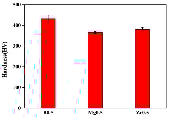 Figure 6 displays the average micro-Vickers hardness values and standard deviations for the three as-cast HEAs, as measured by the Vickers hardness tester at room temperature. It can be seen that the B0.5 HEA has the highest hardness (433 HV), followed by the Zr0.5 HEA (380 HV) and the Mg0.5 HEA (365 HV). The corresponding standard deviations are 14.42 HV, 5.98 HV and 3.01 HV, respectively. The results show that the hardness of Mg0.5 and Zr0.5 HEAs is lower than that of B0.5 HEA. The hardness of the alloy is affected not only by the type of phase in the microstructure but also by its content. All the HEAs have FCC/L12 phase and BCC phase, according to XRD and EBSD analyses. Compared with B0.5 alloy, the FCC phase fraction is more dominant in Mg0.5 and Zr0.5 HEAs. It is worth noting that FCC has more slip directions and is more susceptible to slip deformation than BCC. This may result in a more plastic but less hard alloy for FCC structures. Although Mg and Zr with large atomic radius have better solution strengthening effect than B, this effect may be weaker than the phase weakening of large volume fraction FCC crystal structure. As a result, Mg0.5 and Zr0.5 alloys have a lower hardness value than the B0.5 alloy. Although the proportion of the FCC phase in the Mg0.5 HEA is approximately the same as the Zr0.5 HEA, the hardness of the Zr0.5 alloy is higher than that of the Mg0.5 alloy. This may be because the addition of the Zr element can greatly refine the microstructure of the alloy. In addition, Zr has a larger atomic radius than Mg, which increases the distortion of the cell and enhances solid solution hardening. Hence, it not only reduces the grain size of the alloy but also increases the number of dislocations in the alloy, which increases the brittle tendency of the alloy and leads to slightly higher hardness than Mg0.5 HEA [,,,].