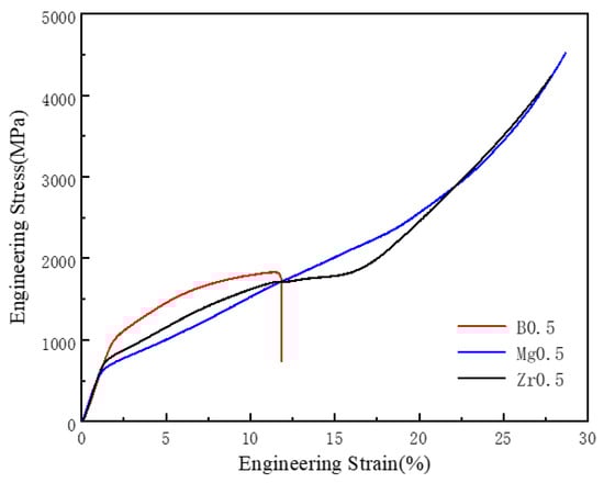The average values of the elastic modulus of each alloy obtained by room temperature compression experiment are 57.31 GPa (B0.5), 42.40 GPa (Mg0.5), and 53.10 GPa (Zr0.5), respectively. The results show that the alloys with B have higher elastic modulus than those with Mg or Zr. Compared with B doped alloy, the addition of Zr or Mg reduces the elastic modulus of the alloy, thus reducing the stiffness of the material.