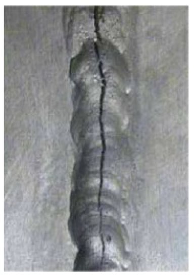 Crack defects are fissures that grow along the weld bead. These linear-like defects in WAAM can occur for several reasons. The aspect of this defect is shown in Figure 3.