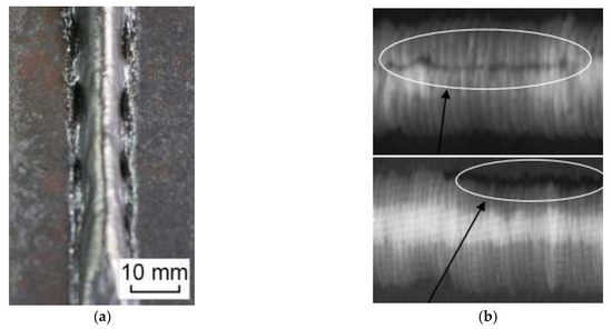 Burn-through defects (a) in a plate, adapted from [12], and (b) identified in an X-ray test of a weld bead, adapted from [4].