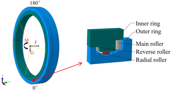 According to the operating conditions in the literature [4], the overturning moment M of the cutterhead was 8000 kN·m, the gravity G of the cutterhead was 800 kN and the thrust F of the cutterhead was 5000 kN. Under these working conditions, the maximum load of main rollers was 195.3 kN, the maximum load of the reverse rollers was 30 kN, and the maximum load of radial rollers was 20.2 kN. It should be noted that each roller is not subject to the same load. Taking the reverse rollers as an example, the maximum load of the reverse rollers was 30 kN, which was located at the upper end of the main bearing, i.e., π rad position, as shown in Figure 5. Since the load on each roller was not uniform, we assumed that the roller rolls around the ring for one circle and was only loaded in the region with the largest load, i.e., the region of 3/4π–5/4π, and the load was always 30 kN. Similar assumptions also applied to main rollers and radial rollers. Fatigue damage simulation of the main bearing was carried out according to the method in the previous section. Under different working hours, the damage D of each part of the main bearing is shown in Table 3.