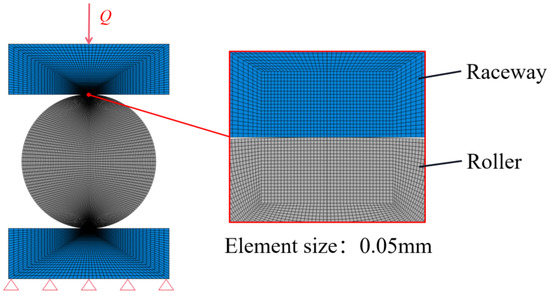 Cylindrical rollers were used for all three rows of rollers in the main bearing of the TBM. In order to reduce the calculation scale, the contact problem between rollers and rings was simplified into a plane strain problem. The finite element model is shown in Figure 3, where the blue part represents the raceway of the ring, and the gray part represents the roller. The material properties of raceway and roller are shown in Table 1 [4]. Since the model was symmetric, only a quarter of it needed to be taken for the calculation. The mesh was encrypted in the contact area between the roller and the raceway with a side length of the elements of 0.05 mm. In Abaqus, CPE4R elements were assigned to the finite element model with a total number of elements of 16,000. Normal contact behavior was defined as “hard contact “ and tangential friction coefficient was defined as 0.05 [15].