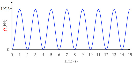 Next, two steps were set up in Abaqus. In the first step, a small pressure was applied to the upper part of the raceway, which enabled the model to establish a stable contact relationship. In the second step, cyclic load Q was applied to the upper part of the raceway, and its changes over time are shown in Figure 4. We assumed that the speed of the main bearing is 6 r/min, then the relationship between time and the number of cycles could be deduced according to the geometric relationship, as shown in Table 2.
