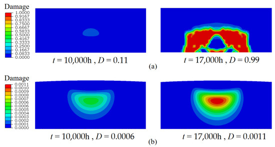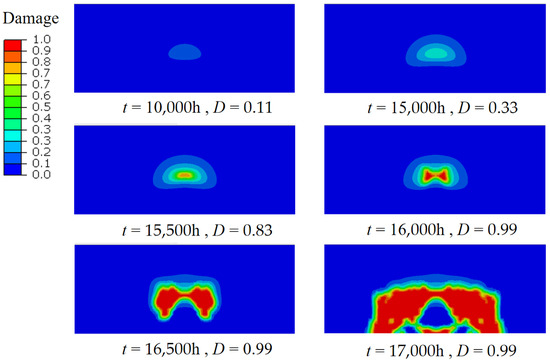 Taking the simulation results of the main raceway as an example, the damage evolution over time is shown in Figure 7. From the perspective of spatial domain, the damage of the raceway starts from a subsurface position 0.6 mm from the raceway surface and extends to the surface along a horizontal angle of 45°, gradually forming fatigue spalling, which was consistent with the results in the literature [15], as shown in Figure 8. From the perspective of time domain, when the working time is less than 15,000 h, the damage evolution of the main push raceway is slow. When the working time reaches 15,000 h, the damaged area expands rapidly, and the maximum damage increases from 0.33 to 0.99 in only 1000 h. Therefore, it is recommended to set the critical damage as 0.3.