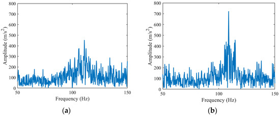 FFT spectrum of the vibration signal: (a) Before main bearing damage; (b) After main bearing damage.