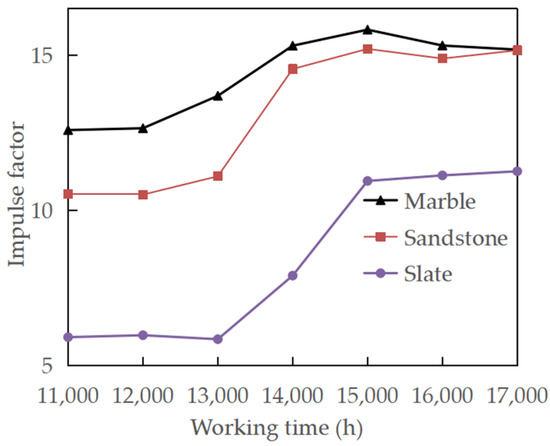 Impulse factor is the ratio of peak value to arithmetic mean value, which is used to detect the presence of shock components in the signal. Figure 15 shows the impulse factor curves of vibration signal with time under three geologies.