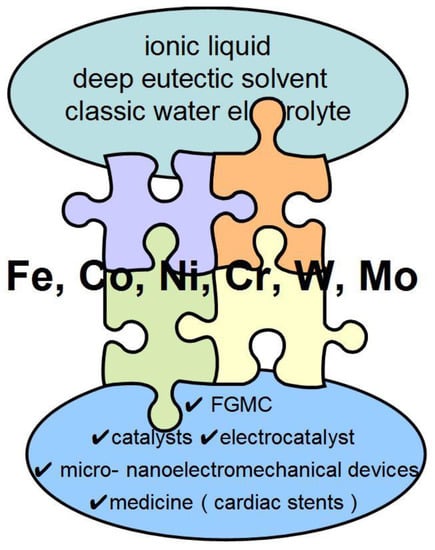 While highlighting the ability to form a smooth and homogeneous FGMC, alloys were divided into two groups: two- and three- component systems based on the metals of the iron triad with chromium or with carbon and phosphorus [3,4,5,6,7,8,9,10,11], and alloys containing tungsten or molybdenum. The alloy composition is chosen on the basis of its possible applications. Alloys can be applied as FGMC [12], catalysts [13], elements of micro- and nanoelectromechanical devices [14], and electrodes-electrocatalysts in the water electrolysis process [15]. The unique acid resistance and microhardness of two-component alloys based on the iron triad with Mo and W makes them an improved alternative to chromium coatings [16,17].