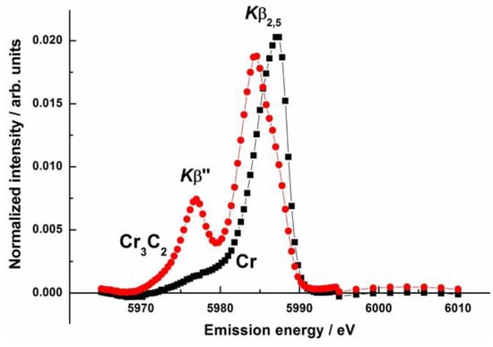 - Safonov, V.A.; Habazaki, H.; Glatzel, P.; Fishgoit, L.A.; Drozhzhin, O.A.; Lafuerza, S.; Safonova, O.V. Application of Valence-to-Core X-Ray Emission Spectroscopy for Identification and Estimation of Amount of Carbon Covalently Bonded to Chromium in Amorphous Cr-C Coatings Prepared by Magnetron Sputtering. Appl. Surf. Sci. 2018, 427, 566–572. [Google Scholar] [CrossRef]