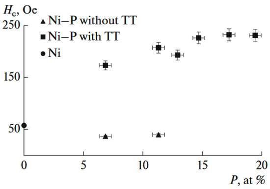Effect of the phosphorus content on the coercive force of Ni–P coatings in the initial state and after thermal treatment relative to the coercive force of pure nickel. Reproduced from [7] with permission from Pleades Publ., 2017.