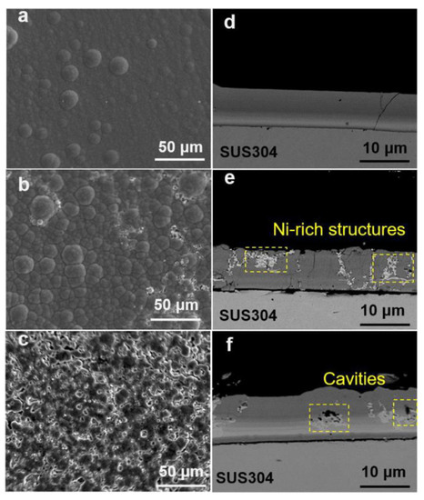 SEM micrographs of the surface (a–c) and cross-sectional micrographs (d–f) of coatings prepared from electrodeposited NiCrP alloys at the current densities (a,d) 10 A/dm2, (b,e) 15 A/dm2, (c,f) 20 A/dm2. Reproduced from [8] with permission from Elsevier, 2021.