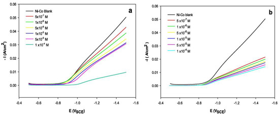 Potentiodynamic cathodic polarization curves for the Ni-Co alloy electrodeposition from the Ni70%-Co30% bath in the absence and presence of different concentrations of (a) [MOFIM]I, (b) [FPIM]Br at pH 4.5. Reproduced from [19] with permission from Elsevier, 2021.