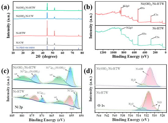 (a) XRD patterns of Ni/CW, Ni-HTW, Ni(OH)2/Ni/CW, and Ni(OH)2/Ni-HTW electrodes. (b) XPS full spectra of Ni-HTW and Ni(OH)2/Ni-HTW electrodes. Fine spectra of (c) Ni 2p and (d) O 1s for Ni-HTW and Ni(OH)2/Ni-HTW electrodes.