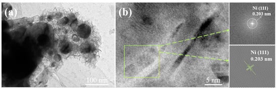 TEM and HR-TEM characterizations also revealed the structure and phase composition of the electrodes. The TEM images in Figure 4a,b show the surface microstructure of the Ni(OH)2/Ni-HTW electrode, where a nanosheet structure was successfully deposited on the surface of the Ni-based hollow tube. As shown in the HR-TEM image, the lattice stripes at d = 0.203 nm can be attributed to the (111) crystalline plane of Ni. In the corresponding selected electron diffraction pattern, a broad and diffuse halo ring is observed, an indication of an amorphous state, which implies that the material is not highly crystallized. With the literature and the analysis of the electrodeposition process taken into consideration, it can be concluded that a large amount of amorphous material is Ni(OH)2 nanosheets, from which it is inferred that the surface microstructure after electrodeposition is a crystalline–amorphous, core–shell heterostructure in the form of Ni-Ni(OH)2 [].