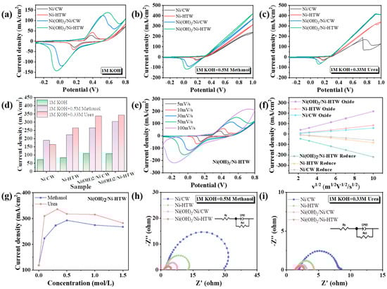 CV curves of Ni/CW, Ni-HTW, Ni(OH)2/Ni/CW, and Ni(OH)2/Ni-HTW electrodes in (a) 1 M KOH solution, (b) 1 M KOH + 0.5 M methanol solution, (c) 1 M KOH + 0.33 M urea solution at a scan rate of 50 mV/s. (d) Current density at 0.8 V for different electrodes in different solutions. (e) CV curves of Ni(OH)2/Ni-HTW electrode in 1 M KOH at different scan rates. (f) Redox peak current densities versus v1/2 for Ni/CW, Ni-HTW, and Ni(OH)2/Ni-HTW electrodes at different scan rates in 1 M KOH. (g) Current density at 0.8 V for Ni(OH)2/Ni-HTW electrode in methanol and urea solutions of different concentrations. EIS plots of different electrodes in (h) 1 M KOH + 0.5 M methanol solution and (i) 1 M KOH + 0.33 M urea solution.