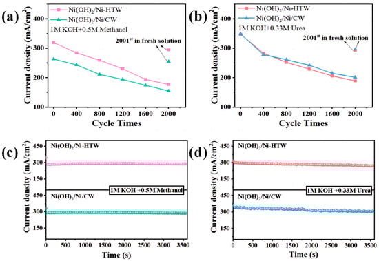 Current densities at 0.8 V for Ni(OH)2/Ni/CW, Ni(OH)2/Ni-HTW electrodes in (a) 1 M KOH + 0.5 M methanol solution and (b) 1 M KOH + 0.33 M urea solution for 2000 cycles. Chrono-current test for Ni(OH)2/Ni/CW and Ni(OH)2/Ni-HTW electrodes in (c) 1 M KOH + 0.5 M methanol solution and (d) 1 M KOH + 0.33 M urea solution at 0.8 V for 3600 s.