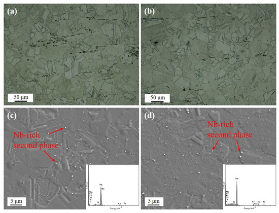 Figure 1 presents OM images of samples S1 and S2, which showed similarities in their microstructures, i.e., grain size (Figure 1a,b) and a uniform distribution of NbC (insert in Figure 1c,d) within the grains and at grain boundaries. The results suggested that Mo did not have a significant effect on the microstructure in the steels produced for this study. It helped to exclude the effects of grain size or grain boundary density on the oxidation behaviors of the two steel samples.