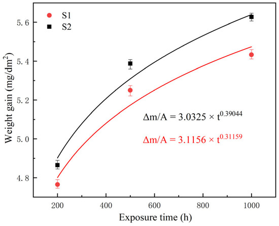 Figure 2 shows the average weight gains of the two samples as a function of exposure time in high-temperature CO2. The weight gain of both samples followed an approximately parabolic trend as a function of exposure time, indicating that the oxidation kinetics were a diffusion-controlled process. In all test samples, the weight gains of the S1 samples were consistently lower than those of the S2 samples, confirming the enhancement of oxidation resistance with the addition of Mo. The variation in the change in mass with time can be fitted as follows [16]: