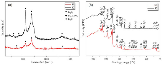 Figure 3a presents the Raman spectra of the two investigated samples after exposure to high-temperature CO2 at 650 °C under 3.5 MPa for 1000 h. The results indicate that the surface oxide scales grown on all tested samples were composed primarily of magnetite (Fe3O4), spinel-type Fe3-xCrxO4 (0 < x < 2), and a small amount of hematite (Fe2O3), which agreed with the data reported in the literature [17]. Figure 3b shows the results of the XPS analysis of the oxidized surfaces of samples S1 and S2 after 1000 h of exposure. It was easy to find the signals of Cr and Fe, which suggested the presence of corresponding oxides in the outermost oxide layer. A small peak of Mo signals in the XPS spectrum of sample S1 could be seen, indicating the existence of Mo-containing oxides on the surface.