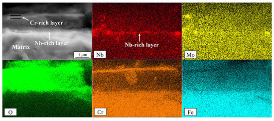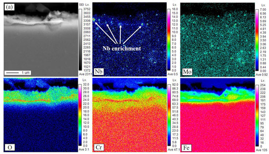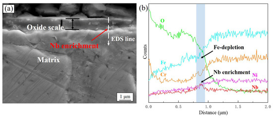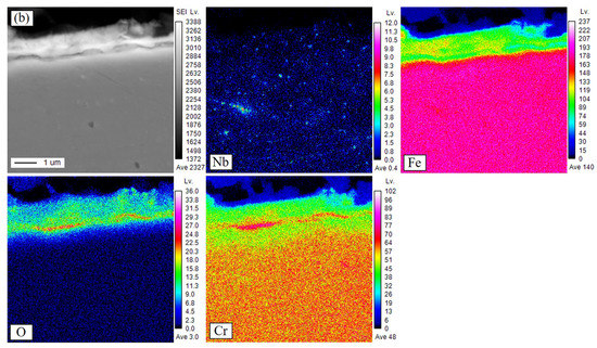 Figure 7 shows the cross-sectional SEM image and corresponding EDS results of sample S2 after exposure for 1000 h. Compared with sample S1, there were no significant differences in the thickness and structure of the oxide scales formed on sample S2, as shown in Figure 7a. Enrichment with Nb also mainly appeared at the oxide/matrix interface according to the EDS line profile, as shown in Figure 7b. The high-magnification SEM image (Figure 8) shows that the oxide scales consisted of an outer Cr-rich layer and an inner spinel oxide, as confirmed by the corresponding EDS mapping results. Further observation (Figure 8) revealed that there was also enrichment with Nb at the oxide/matrix interface, but no continuous Nb-rich layer were formed as they were in sample S1, indicating the lower outward diffusion of Nb in sample S2.