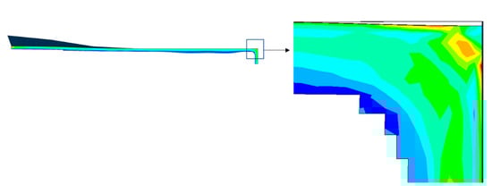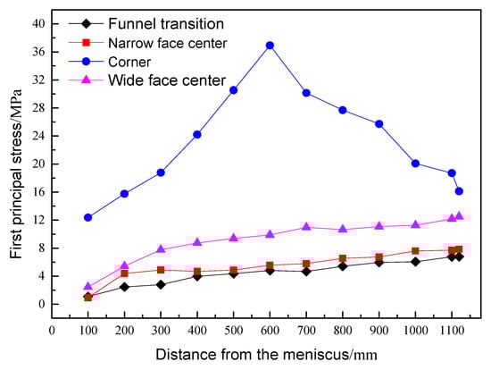 - The distribution rule of the first principal stress of the shell shows that the maximum value of the first principal stress appears at the corner. In the slab drawing direction, the first principal stress at the corner of the slab shell first increases and then decreases. The peak value of the first principal stress appears at 600 mm below the meniscus, and the maximum value is 36.9 MPa. At the center of the wide face, the center of the narrow face, and the transition position of the funnel, the first principal stress of the shell increases gradually with the increase in the distance from the meniscus.
