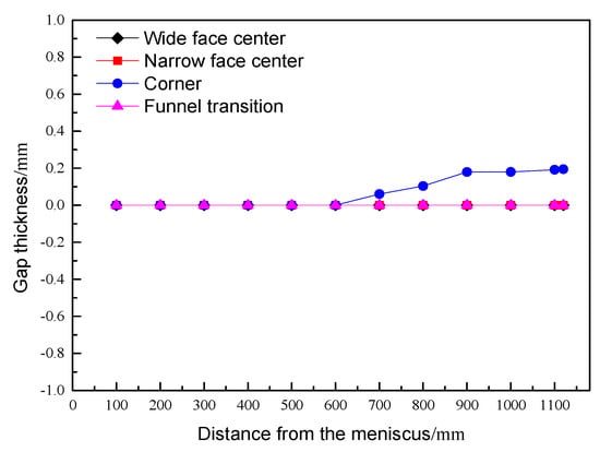 - From the initial complete solidified position of the slab to the position 600 mm below the meniscus, the surface of the slab is in close contact with the copper wall. As the slab continues to move downward, the gap at the corner position is gradually formed. At the mold outlet position, the corner gap thickness is 0.195 mm. At the center of the narrow face, the funnel transition, and the center of the wide face, there is no gap between the shell and the copper wall.