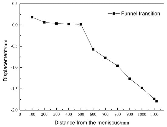 - At the upper part of the mold, the shell of the funnel transition zone is shifted to the parallel zone. When the shell moves down to 500 mm below the meniscus, the shell in the transition zone begins to move towards the funnel zone. At the exit of the mold, the slab shell is shifted 1.79 mm towards the funnel area.