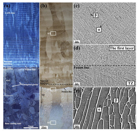 Figure 2a presents the macrostructure of the hybrid TC4 sample, and no solidification defects are found. The interface between the first-laser deposition layer and the casting substrate is defined as the fusion line, which is located below the nominal interface. Owing to the different grain morphologies, three different zones can be clearly observed in the YZ plane of the hybrid sample: the laser additive manufacturing zone (LAM zone), the heat affected zone (HAZ) and the base casting zone. As can be seen in Figure 2a,b, different from the coarse equiaxed grain morphology in the base casting zone, the grain size in the bottom of the LAM zone is small and exhibits a mixed morphology of equiaxed grain and columnar grain.