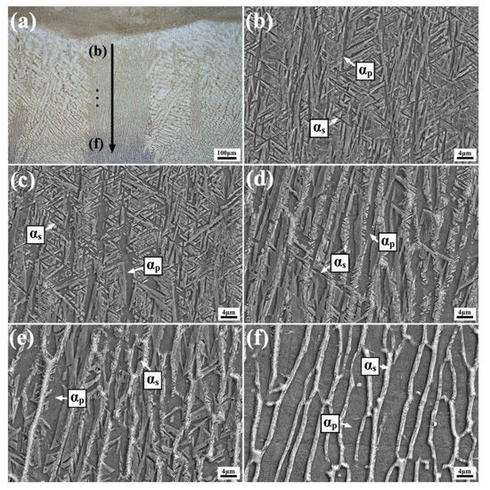 The microstructure in the TZ of the hybrid sample is observed in detail and presented in Figure 3, where Figure 3b is acquired at 100 μm from the fusion line, and Figure 3b–f is obtained at 100 μm intervals, respectively. Different from the fine basket-wave microstructure adjacent to the fusion line, the bimodal microstructure consists of primary α (αp) and superfine β transformed microstructure (lamellar secondary α (αs) and retained β) is observed with the depth close to the base casting zone. The volume fraction of αp increases from the near LAM side to the near base casting side in the TZ, whereas the volume fraction of β transformed microstructure and the size of αs changes on the opposite. The microstructure in Figure 3f is almost the same as that of the base casting zone except for a few broken and coarsened β phases. Similar microstructure changes are also found in the HAZ of hybrid fabricated Ti–6.5Al–3.5Mo–1.5Zr–0.3Si alloy by laser additive manufacturing and forging [14].