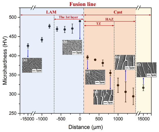 The microhardness profile of the hybrid manufacturing TC4 sample is shown in Figure 4. The microhardness of the LAM zone in the upper large columnar grain region is about 420 HV, which is 105 HV higher than the base casting zone due to the refined microstructure. Taking the fusion line as the origin, microhardness in the range of −1000 μm~1400 μm around the fusion line is measured in detail. The microstructure images corresponding to some of the typical locations are also presented in Figure 4. In general, microhardness in different locations of the hybrid sample is closely related to the α lath morphology. As can be seen, microhardness in the extremely fine basket-wave microstructure region of the bonding zone is the highest ((b) in Figure 4). It reaches 491 HV. And then microhardness of the ultra-fine microstructure region ((a) in Figure 4), the fine microstructure region ((c) in Figure 4), the base casting zone ((f) in Figure 4) and the elongated grain region ((e) in Figure 4) reduces in order. In the HAZ, microhardness decreases as the distance from the fusion line increases due to the decrease in the αs phase and the coarsening of the α or αp phase.