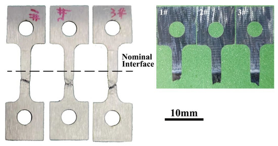 The decreased elongation of the hybrid sample is mainly due to the non-uniform deformation during the tensile process. Generally, plastic deformation occurs when tensile stress exceeds the yield strength of the alloy during the tensile process [35]. According to Table 1, the yield strength of the hybrid sample ((775 ± 24) MPa) is a little higher than that of the pure casting sample ((732 ± 21) MPa), both of which are much lower than that of the LAM sample (>950 MPa). The ultimate tensile strengths of the hybrid sample and the pure casting sample are even lower than the yield strength of the LAM sample. During the tensile deformation of the hybrid sample, when the tensile stress increases to the yield strength of the hybrid sample, the casting half begins to yield, and obvious plastic deformation occurs. However, no obvious deformation occurs in the LAM half at the same time, because the tensile stress has not reached its yield strength. Until the tensile stress reaches, the ultimate tensile strength of the hybrid sample and fracture happens in the HAZ of the casting half, the LAM half may still not experience obvious plastic deformation (Figure 9). Therefore, the casting half part contributes most of the total elongation of the hybrid sample, which is inevitably less than that obtained by the total length tensile pure casting sample. Similar phenomena are found in the tensile tests of forging/LAM hybrid-manufactured titanium alloys [14,36].