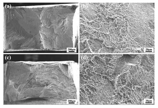 The room temperature tensile properties of the hybrid sample and the pure casting sample are shown in Table 1. The tensile property of the LAM sample is not tested in this research due to the size limitation and the anisotropy of the LAM sample. Instead, the tensile properties of the LAM TC4 alloy reported in other research [21,22,23,24] with similar microstructure characteristics as this research are listed in Table 1 as the reference. As can be seen, the strength of the hybrid sample falls between those of the LAM sample and the pure casting sample, whereas the elongation of the hybrid sample is the lowest among the three samples. Figure 5 presents the fracture position of the hybrid samples after the tensile test, and all the hybrid samples fracture at the HAZ of the casting half part. Fracture surfaces of the pure casting sample and the hybrid sample are exhibited in Figure 6. The fracture surfaces of both samples consist of a fibrous zone and a shear rupture zone (Figure 6a,c). Higher magnification images (Figure 6b,d) show a dimpled morphology in the pure casting sample and mixed dimple and cleavage mode in the hybrid sample.