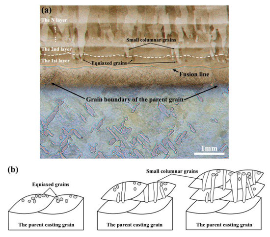 According to Figure 2a,b, in this hybrid manufacturing process, grains in the bottom of the LAM zone are much finer with a mixture of equiaxed grain and small columnar grain, and gradually coarsening to fully large columnar grains growing consecutively through many layers. A higher magnification image (Figure 7a) presents that the bottom small columnar grains are epitaxially grown from equiaxed grains and then competitive growth or are blocked by the equiaxed grains at the top of the deposition layer. Accordingly, Figure 7b schematically illustrates the grain formation mechanism at the bottom of the LAM zone. In the first layer of laser deposition, typical epitaxial growth of the parent casting grains occurs at the pool bottom, and equiaxed grains are formed at the top of the deposited layer. There are two mechanisms for the formation of equiaxed grains, the heterogeneous nucleation of the residual or partially melted solid powders and the columnar-to-equiaxed transition (CET) [28,29,30,31]. In the second layer of laser deposition, only part of the equiaxed grains is remelted, and the epitaxial growth of the preserved equiaxed grains occurs, forming small columnar grains. Within the melting pool, columnar grains grow competitively or are blocked by the equiaxed grains at the top of the deposition layer, forming a mixture of equiaxed grains and small columnar grains at the bottom of the LAM zone.