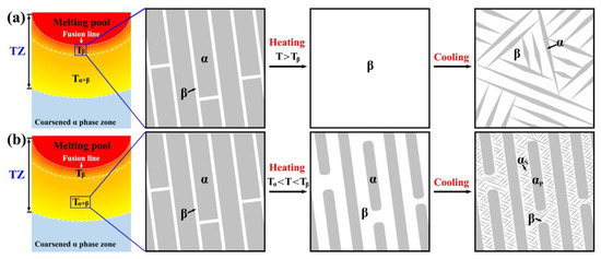Microstructure evolution in the TZ of the hybrid sample during the LAM process can be schematically illustrated in Figure 8. When high-energy laser beam scans on the casting substrate, a high temperature melting pool forms and its beneath substrate is heated instantaneously, causing the formation of HAZ [34]. In the region adjacent to the melting pool, the peak temperature is inevitably above the β transus point (Tβ) of titanium alloy. As it approaches the core of the casting substrate, the peak temperature decreases gradually to Tα+β and then to room temperature. Tβ and Tα+β region in the HAZ of the hybrid sample is schematically illustrated and separated by the white dotted line in Figure 8.