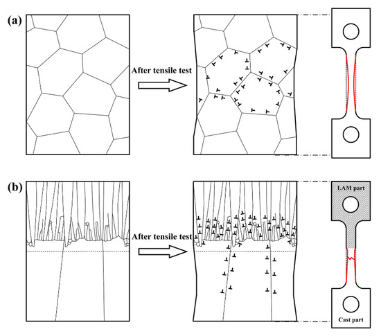 According to Table 1 and Figure 5, the tensile strength of the hybrid sample is higher than that of the pure casting sample, but its elongation is lower. The increased strength of the hybrid sample is mainly attributed to the smaller grain size and finer microstructure formed in the bonding zone. As revealed in Figure 9, the hybrid sample has refined grain and microstructure in one part and coarser in the other, whereas the pure casting sample has only coarse microstructure, which leads to the average grain size of the hybrid sample being smaller than that of the pure casting sample along the direction of maximum tensile stress, thus result in the increased strength of the hybrid sample (Hall-Petch effect). Moreover, the finer microstructure in the bonding zone (Figure 2d and Figure 3) also contributes to the increased strength of the hybrid sample because the mean free path of dislocation is smaller in the fine microstructure region during the tensile deformation process (Figure 9).