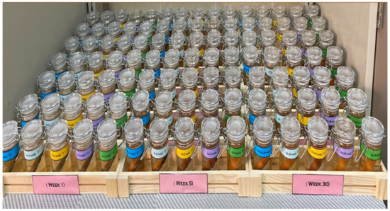 The polished and pre-weighed CSX36 specimens were placed in closed glass containers containing 100 mL soil for different immersion periods (1, 3, 5, 10, 15, 20, 30, 40, 50, 60, 70, and 80 weeks) at an average ambient temperature of the lab (23 ± 1 °C). Samples immersed in various soil solutions and stamped code numbers were used (Figure 2).