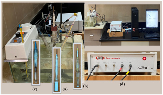 The electrochemical measurements were performed in a round flask with multiple necks, called a three-electrode cell (Figure 3). A cylindrical specimen of CX36 was used as the working electrode, which was embedded in a Teflon holder using epoxy resin, resulting in an exposed area of 0.683 cm2 (Figure 3a). A platinum mesh was used as the counter electrode (Figure 3b), and silver/silver chloride (Ag/AgCl(s)/KClsaturated(aq)) was used as the reference electrode (Figure 3c). Electrochemical measurements were performed using an ACM Gill AC Potentiostat/Galvanostat model 1649 (Figure 3d) connected to a personal computer. Before each experiment, the working electrode was treated as described in the WL method and then dipped in the tested soil solution. Immediately after electrode immersion, the OCP of the working electrode was monitored for 2 h. After reaching steady-state potential, the electrode impedance was recorded as a Nyquist plot. During EIS measurements, an AC disturbance signal of 10 mV was applied to the electrode at the OCP. The measured frequencies ranged from 0.1 to 30,000 Hz. Potentiodynamic curves were obtained by linearly changing the electrode potential from the starting potential (−1000 mV), with the reference electrode at a less negative direction than the required scan rate (1 mV/s) until the end of the experiment at −100 mV. All the electrochemical measurements were performed twice at an ambient temperature (30 ± 1 °C). The EIS data were fitted to appropriate equivalent circuits using the computer program ZSimDemo 3.20 (EChem Software, Ann Arbor, MI, USA), and the PDP curves were analyzed using ACM Gill software (ACM Instruments Ltd, Cumbria, UK).